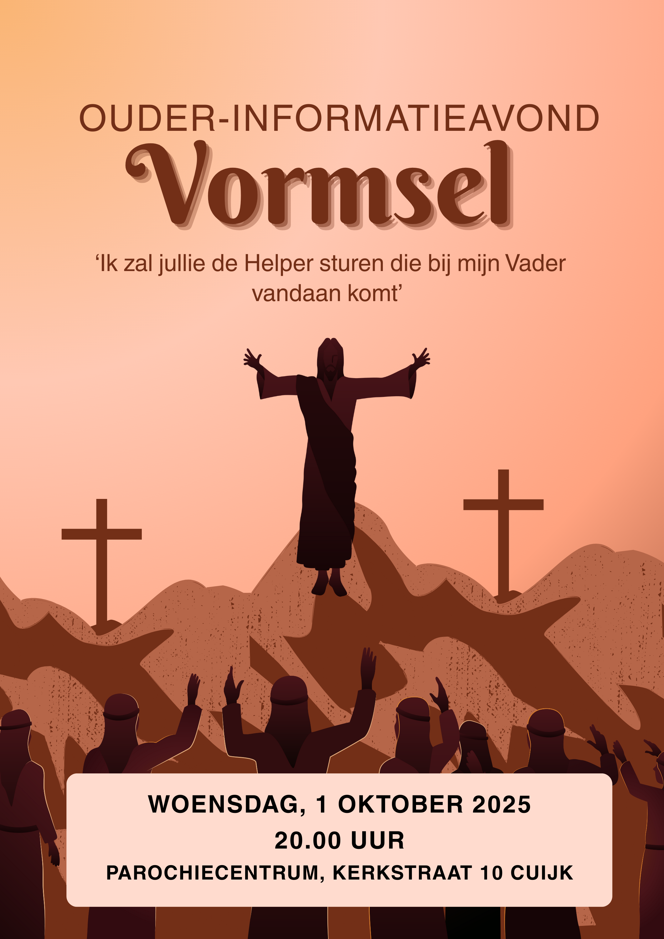 Op woensdag 1 oktober 2025 wordt het verloop van het Vormseltraject uitgebreid toegelicht. Centraal staat wat je als ouder en gezin kunt verwachten en wat wordt er verwacht van jullie. Je bent deze avond om 20.00 uur van harte welkom in het parochiecentrum, Kerkstraat 10 Cuijk.